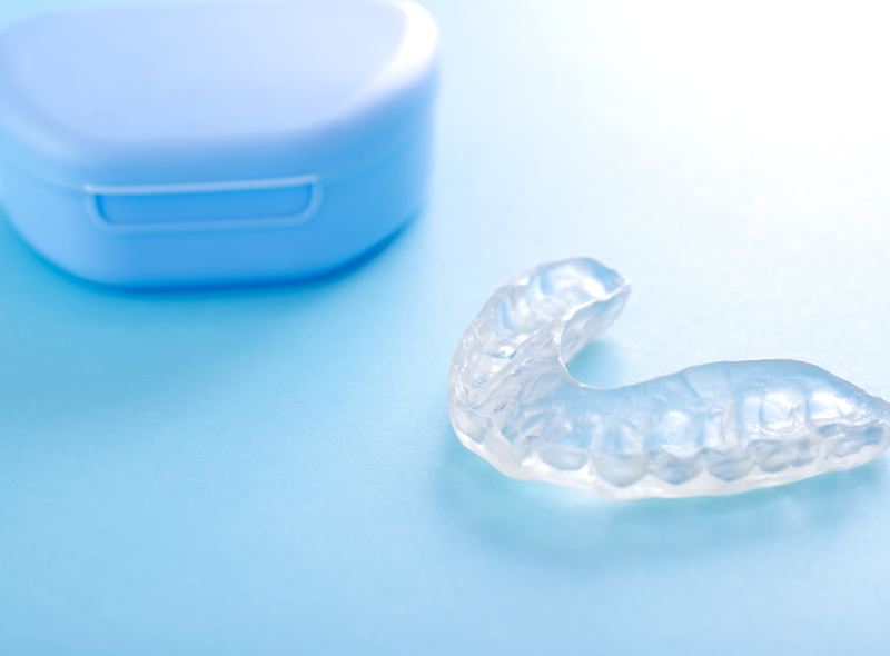 歯ぎしりや食いしばりから歯や顎を守るための有効な手段として、ナイトガードと呼ばれるマウスピースがあります。ナイトガードは、主に就寝時に装着するマウスピースで、歯と歯の間にクッションのような役割を持たせます。歯が直接触れ合うのを防ぐことで、歯の摩耗や欠け、脱落を予防し、その緩衝作用によって顎や歯の根にかかる負担を和らげます。