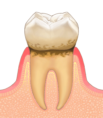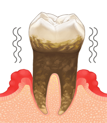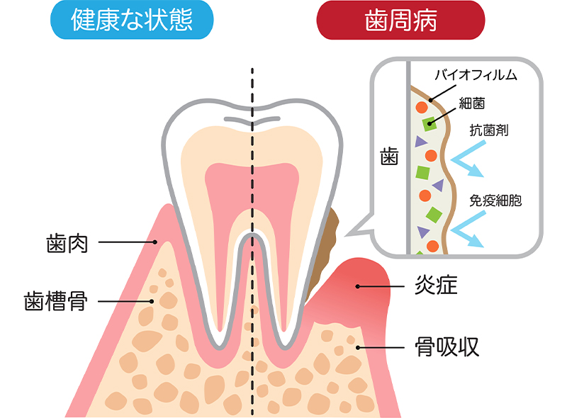 歯周病は、歯垢や歯石に潜む細菌が原因で歯肉に炎症を引き起こし、最終的には顎の骨を破壊していく疾患です。「歯ぐきからの出血」という症状がよく見られるため、歯ぐきの病気と認識されがちですが、実際には歯ぐきだけにとどまらない病気です。